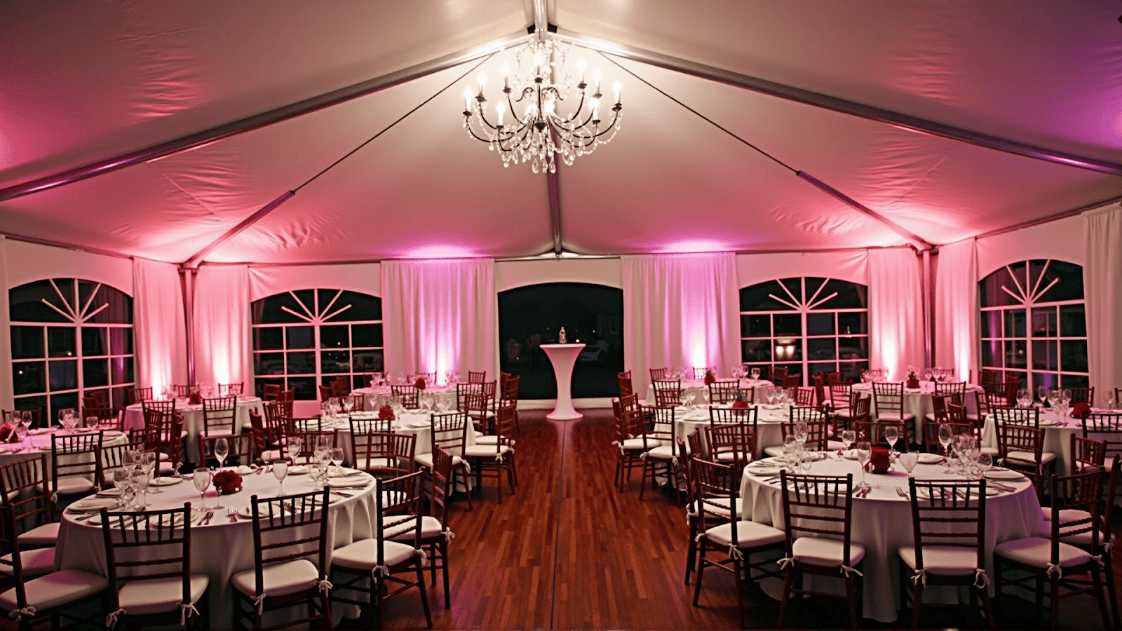 Think Chiavari chairs, draped linens, and crystal glassware. Perfect for weddings, milestone anniversaries, or black-tie galas.